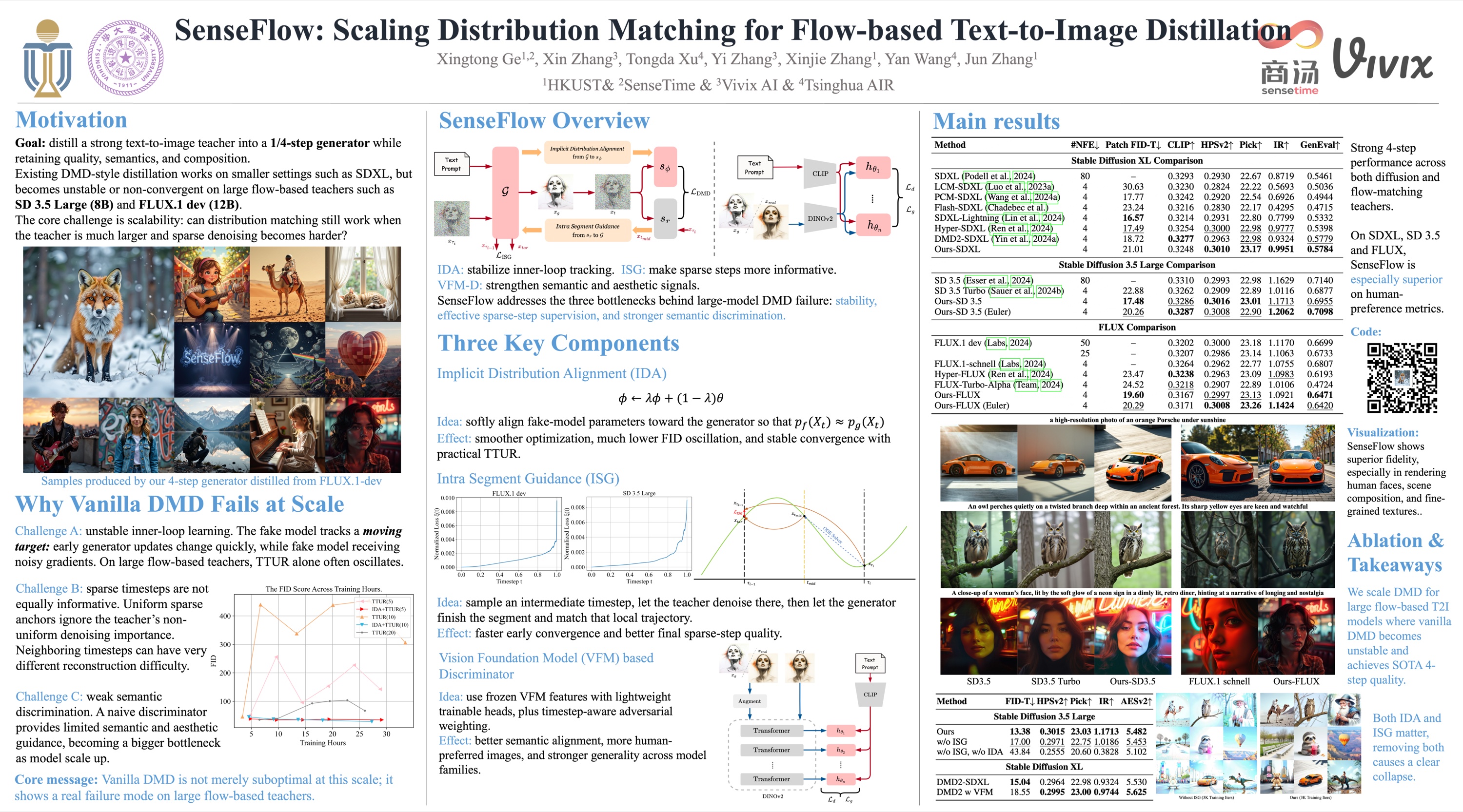 Distribution Matching Distillation (DMD) has been successfully applied to text-to-image diffusion models such as Stable Diffusion 1.5. However, vanilla DMD suffers from convergence difficulties on large-scale flow-based text-to-image models, such as SD 3.5 and FLUX. In this paper, we first analyze the issues when applying vanilla DMD on large-scale models. Then, to overcome the scalability challenge, we propose Implicit Distribution Alignment (IDA) to regularize the distance between the generator and fake distribution. Furthermore, we propose Intra-Segment Guidance (ISG) to relocate the timestep importance distribution from the teacher model. With IDA alone, DMD converges for SD 3.5; employing both IDA and ISG, DMD converges for SD 3.5 and FLUX.1 dev. Along with other improvements such as scaled-up discriminator models, our final model, dubbed SenseFlow, achieves superior performance in distillation for both diffusion-based (SDXL) and flow-matching models (SD 3.5 Large and FLUX).